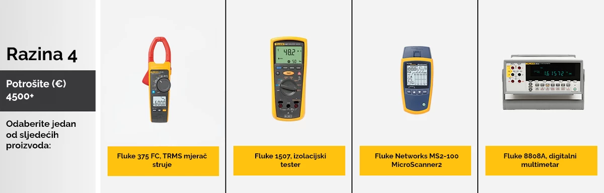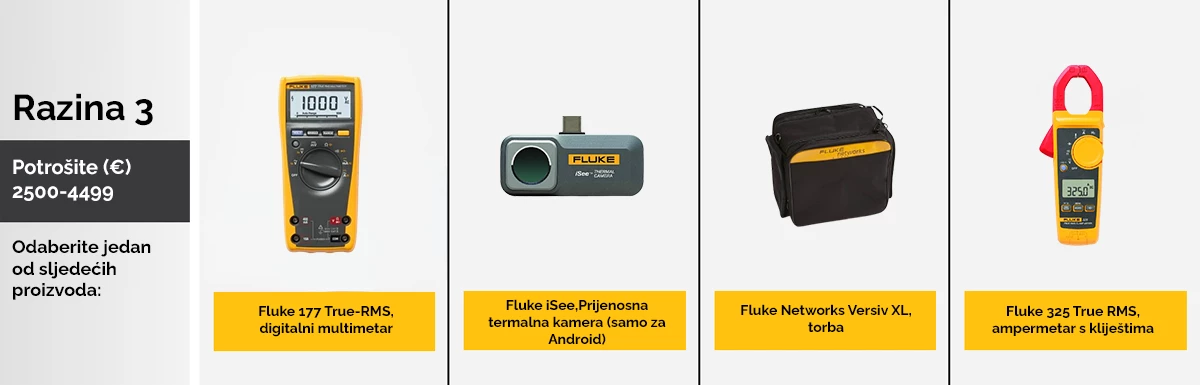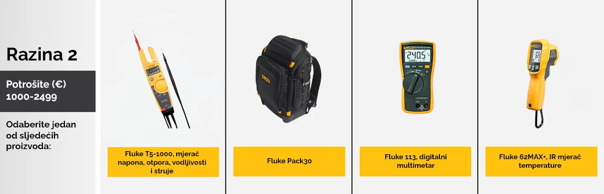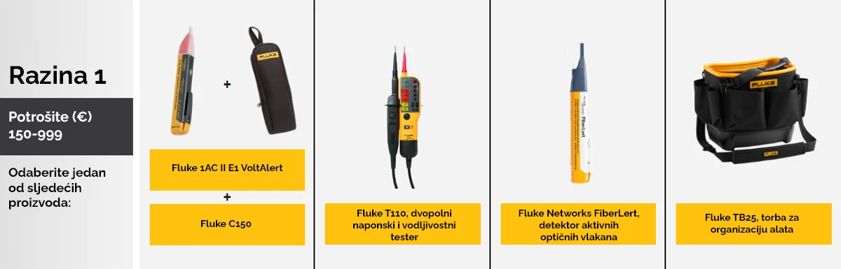 Kada kupite proizvode iz programa Fluke industrial, Fluke Calibration i Fluke Networks u vrijednosti većoj od 150 € + PDV, dobivate poklon u obliku dodatnog besplatnog Fluke proizvoda. Što je veća vrijednost vaše kupnje, veća je i vrijednost poklona.
