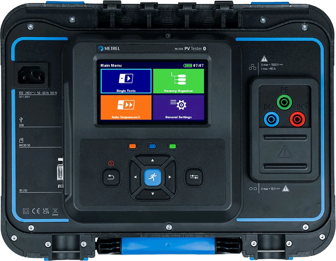 - MI 3114 PV tester je moćan instrument za testiranje fotovoltaik (PV) sustava s maksimalnim naponskim sustavom do 1500 V i maksimalnom strujom kratkog spoja do 40 A
