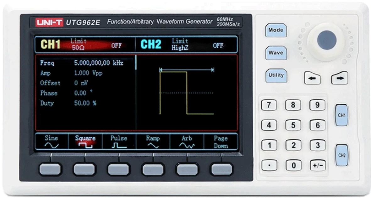 - Izlazni signali: Sinus, Kvadrat, Impuls, Rampa, Šum, DC, Proizvoljni