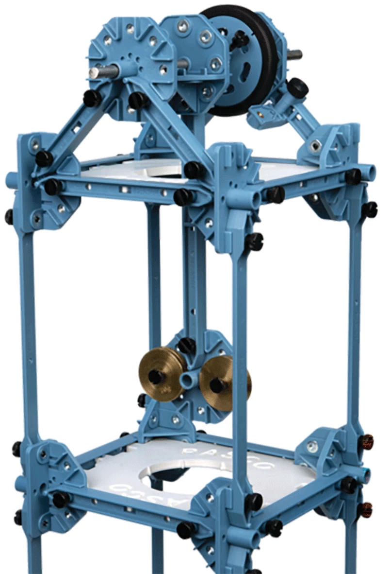 - Izgrađen od PASCO nosača, ovaj toranj je dizajniran da oscilira u svojim različitim rezonancijskim modovima pomoću pokretača koji je pričvršćen gumenom trakom za prvi kat tornja. Bežične ćelije opterećenja s akcelerometrima pričvršćene su na svaki kat kako bi bilježile koliko podrhtavanje svaki kat doživljava.