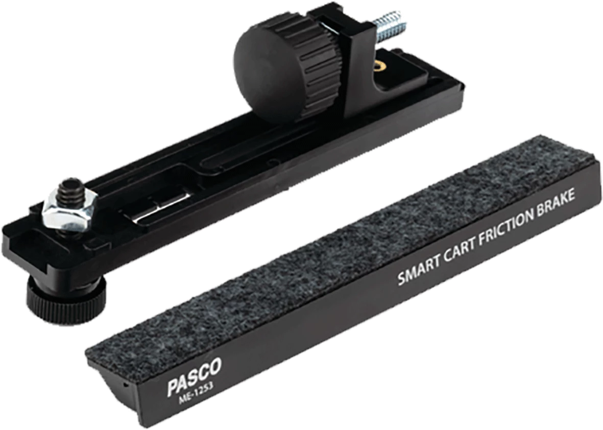Smart Cart ME-1253 kočnica na trenje dizajnirana je za zaustavljanje pokretnog Smart Carta na bilo kojoj poziciji koju korisnik odabere na dinamičkoj stazi. Koristi trenje između filc trake na kolica i zaobljenog vijka za palac na nosaču staze za smanjenje brzine kolica. Dvojni dizajn sastoji se od podloška za trenje (montira se na pribor za Smart Cart) i nosača staze (steže se na svaku PASCO dinamičku stazu). Sila kočenja lako se prilagođava okretanjem gumba na nosaču staze. Idealno za postavke zakrivljenog PAStracka, eksperimente s kosim ravnima ili bilo koji laboratorij koji zahtijeva definiranu poziciju zaustavljanja.