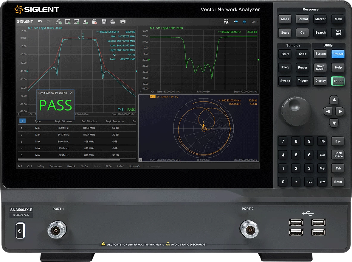 - Serija vektorskih mrežnih analizatora SIGLENT SNA5000X-E ima frekvencijski raspon od 9 kHz do 6,5 GHz, koji podržava mjerenja parametara raspršenja na 2 priključka, diferencijalni parametar i parametre vremenske domene.